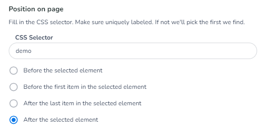 Provide the CSS selector to precisely identify the position on the page where the personalization should appear. It's crucial to ensure the selector is uniquely labeled; otherwise, the system will default to the first one it encounters. This step guarantees that the personalization is accurately placed on the intended location, enhancing its visibility and effectiveness.