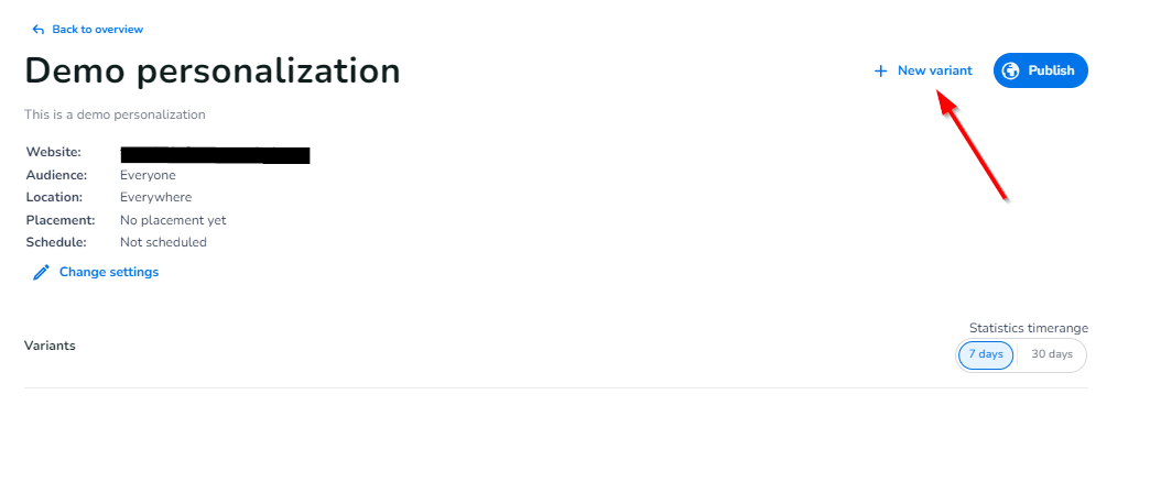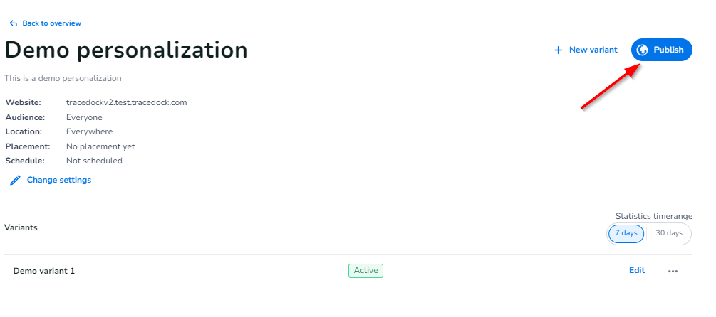 Once you're happy with the result save your variant and publish the personalization. For publishing a personalization you need to have a variant active and the settings of the personalization filled in. If anything is missing a pop-up will appear with the missing details.