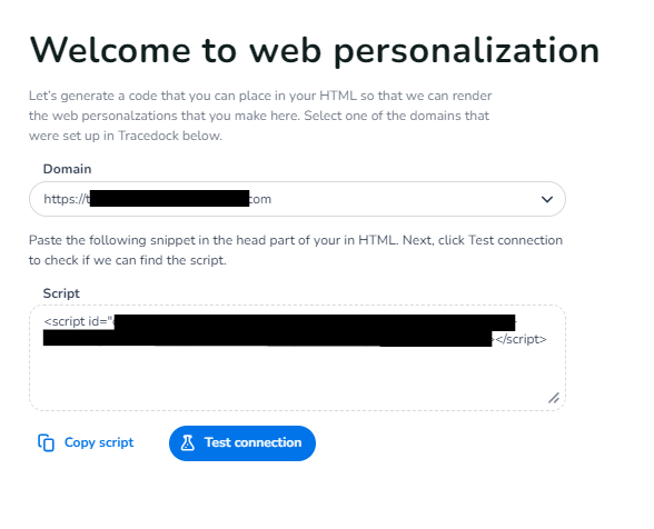 After configuring the webtracker and the domain selection as mentioned above, the next step is to insert a script into your website's header, allowing us to initiate web personalization. Simply choose the domain you established in our webtracking solution and copy the generated script into the HTML head of your website. To verify its functionality, click the "test connection" button.