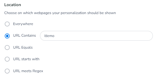 Specify the webpage where you want the personalization to be displayed. This selection ensures that the personalized content or message appears on the designated page, optimizing its relevance and impact for users visiting that specific part of your website.