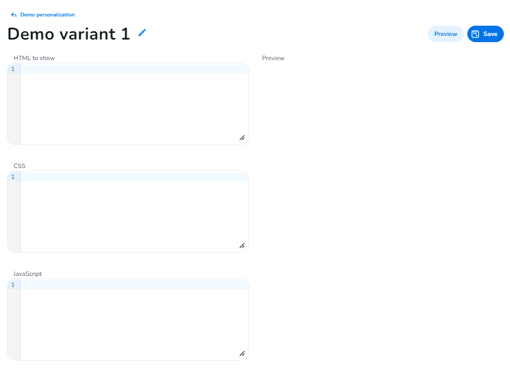 On variant level enter your HTML, CSS and Javascript that you want to show. You can click the preview button to see how it would reflect on your website.