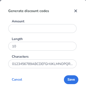 When you let the system generate the codes, the system will ask you how much codes you need, how long each code will be and which characters you will use. Our advise is that you remove the O I 1 and 0 to to avoid misunderstandings.