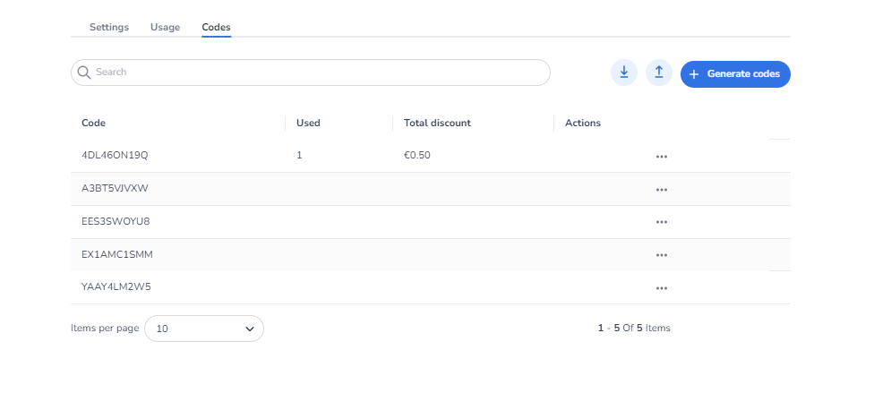 Under the 'Codes' tab you can create discountcodes. These can be generated by the system or through the import function you can import your own code. Import can be done easily by just entering the code in column a of an excel file.