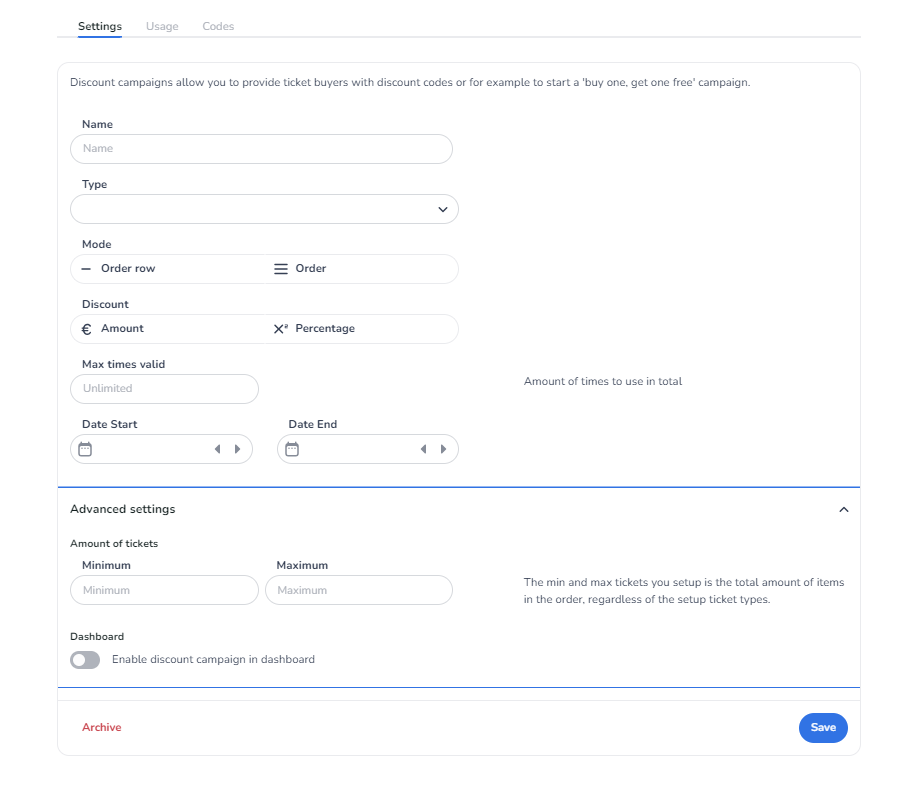 Amount of tickets: At 'Amount of tickets' you can choose to make the discount only valid for a limited number of tickets, e.g. max 1 ticket (enter 1 at maximum) or from the 5th ticket onwards you get a discount (enter 5 at minimum). In fact, you should read Minimum and Maximum separately, i.e.: you must purchase at least x tickets before you can buy max x tickets at a discount.