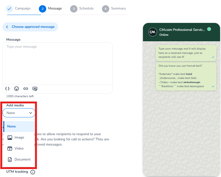 Second, select the media type you’d like to use from the dropdown. Please note that the support of file types and file sizes differ per channel.