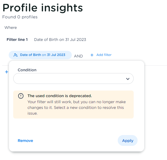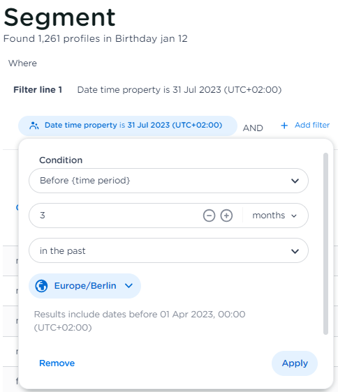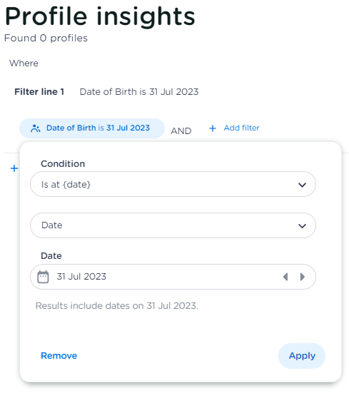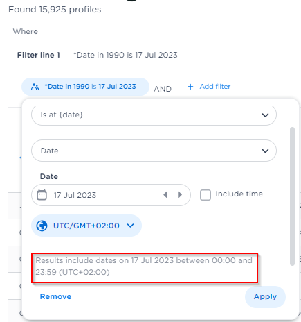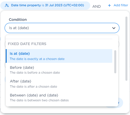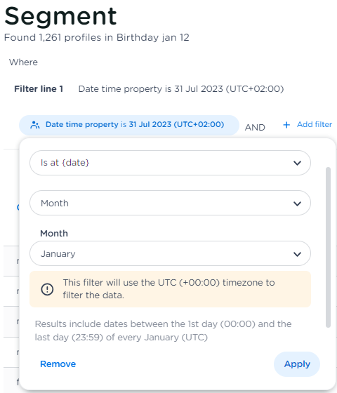 A date filter allows you segment profiles based on having profile property values or event property values that fall within a specific date range.