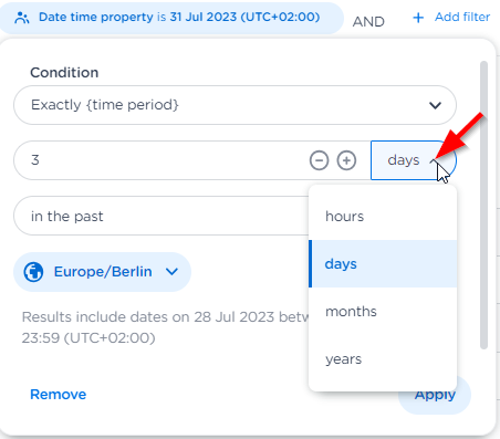 Each of these options have the ability to filter down on hours (not available for the anniversary property), days, months and years in either the past or future.