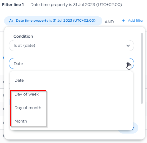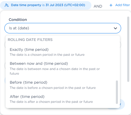 The anniversary property filters have the same options as the date/time properties, so they also have fixed date filters and rolling date filters. Only difference is that they do not include time or timezone selection.
