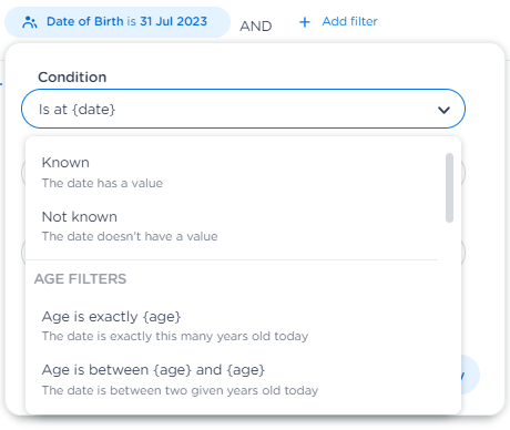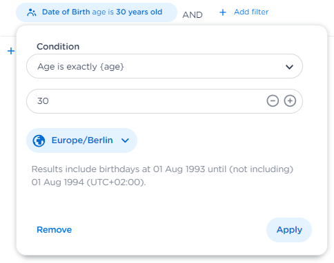 There is one addition to an anniversary property, namely the age filters. You can use them to filter on an exact age or a between age range.