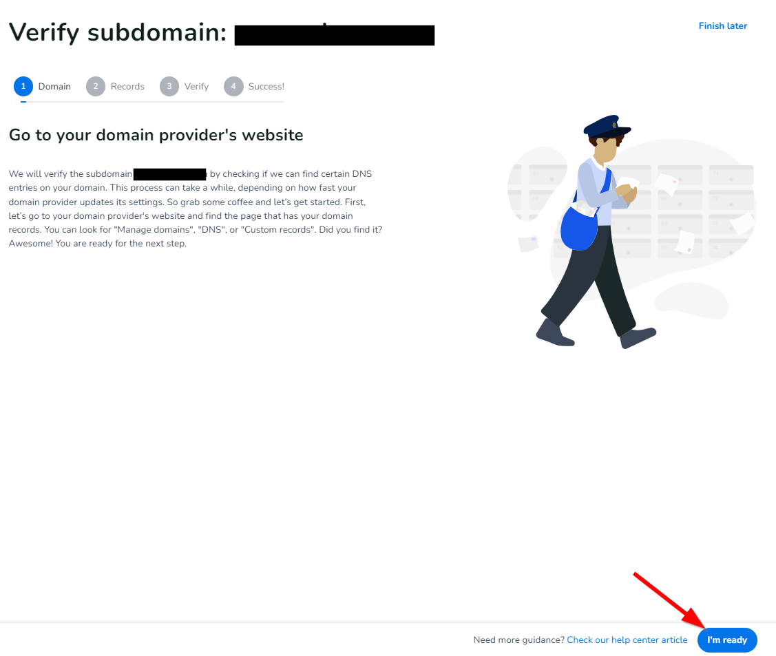 Visit your domain provider's website and locate the page containing your domain records (often labeled as 'Manage Domains,' 'DNS,' or 'Custom Records'). Click "I'm ready" at the bottom of the page to access the records needed for verification.