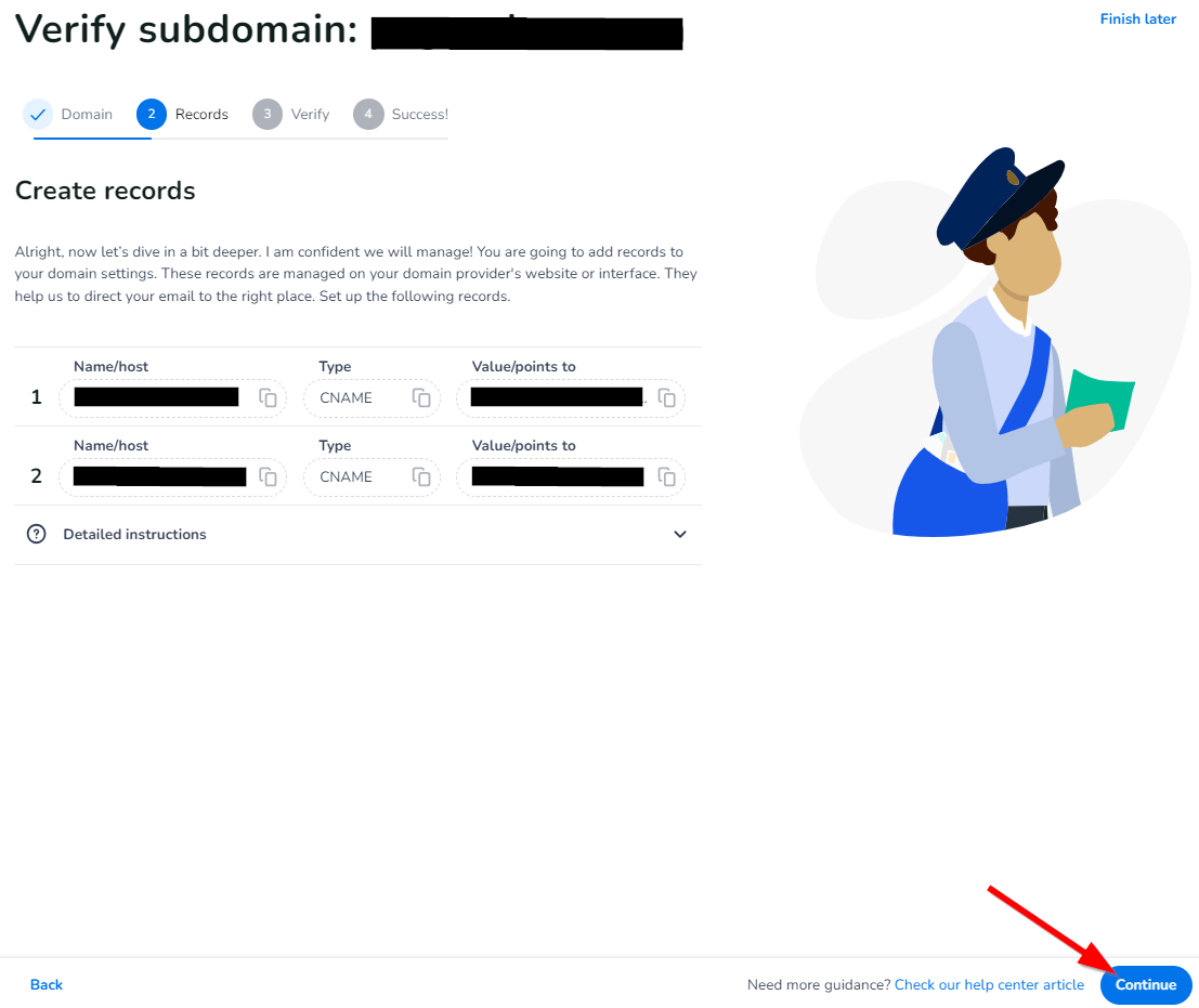 Once filled in on your domain providers' website, click on Continue at the bottom of the page and go to step 3.