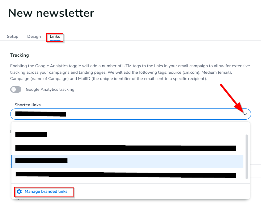 When initiating a new email campaign, navigate to the links tab and access the "Shorten Links" dropdown. Here, you can create a new ShortUrl by selecting 'Manage Branded Links'.