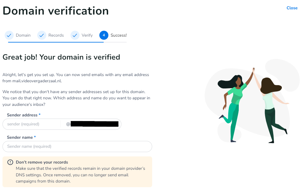 As the final step (Step 4), you will receive notification that your domain is successfully verified and ready for use. At this point, you have the option to update the sender address and sender name. The sender address is conveniently pre-filled with the initially provided email address.