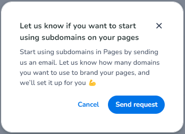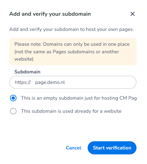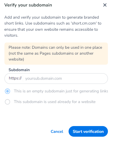 After completing the preliminary steps, you'll seamlessly transition into our standardized process for adding domains. Click on "Add Domain" and precisely indicate the subdomain intended for hosting your page or for use with your branded links. Choose the appropriate option based on your purpose: select "This is an empty subdomain just for hosting CM pages" for pages subdomains or "This is an empty subdomain just for generating links" when incorporating branded links.
