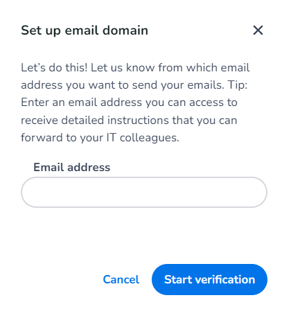 When adding a new domain, specify the email address from which you intend to initiate email sending. Upon clicking "Start Verification," our system will automatically identify the domain associated with the provided email address.