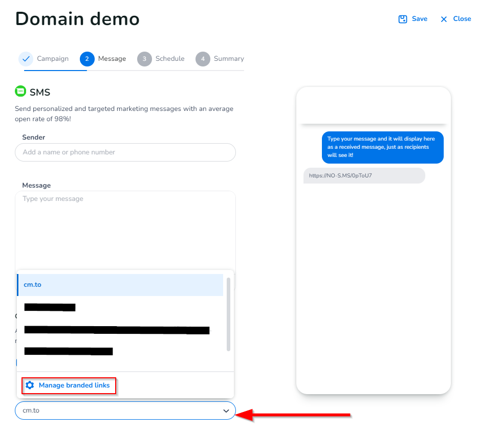 When initiating a new campaign, navigate to the bottom and access the "Shorten Links" dropdown. Here, you can create a new ShortUrl by selecting 'Manage Branded Links'.
