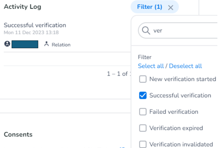 Once verified, this will be immediately visible at the top as soon as you open the relationship. In the activity logs, you can retrieve data on when this took place. Use the filter and search for verification.