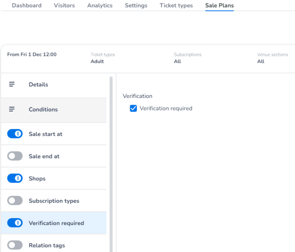 Verification only needs to be set in the sales plan. This also allows you to play with it, e.g. for Kids ticket you don't activate it in the sales plan and for Adult you do.