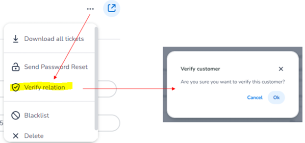 The sales plans only apply to the online shop, you can always issue tickets in the backend without verification. If you want to manually verify in the backend, you always do this at relation level, not at order level. Do this using the 3 dots and you will get a verification question.