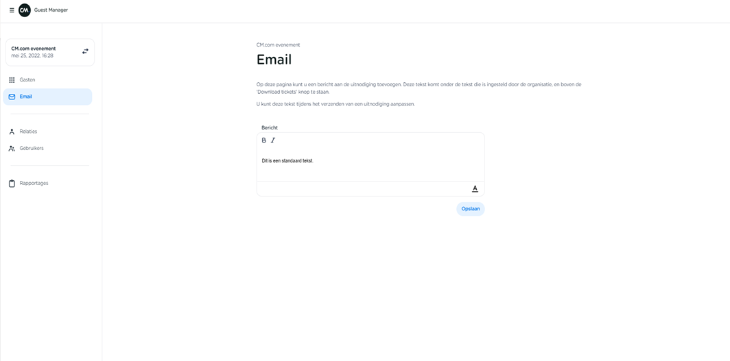 If the personal message for all invitations is the same, a standard text can be set on the Email page that will be added to the standard email text in every invitation.