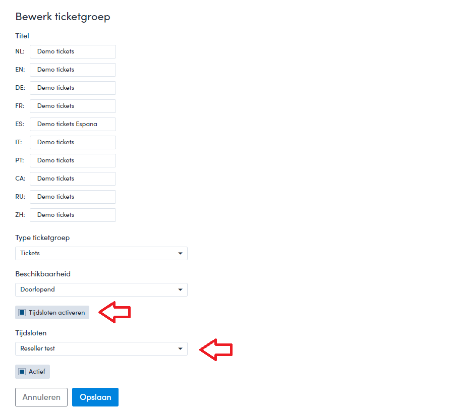 - In het volgende scherm dien je de tijdsloten te activeren en de gewenste tijdsloten groep aan deze ticketgroep te koppelen.