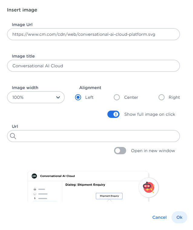 A pop up will appear. Enter a openly accessible image URL, title and adjust the width and alignment if needed. ❗Images hosted on a closed environment (i.e. Sharepoint) will not work.