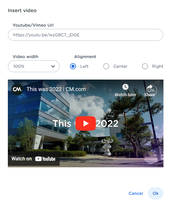 2.Here you can paste the URL from your video. You can also adjust the width and alignment of the video.