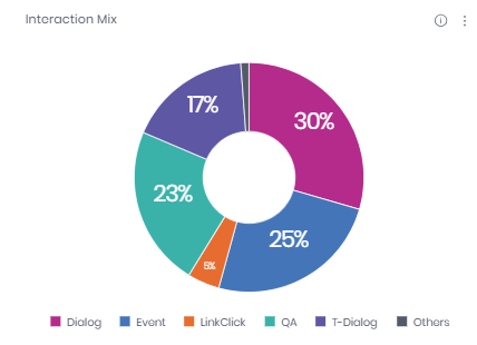 Table of the top interactions over the selected period. This widget by default shows Q&A, FAQClick, FAQSearch, dialog and event interactions. You can filter for a specific interaction type using the Interaction Mix widget. This widget also acts as a filter itself. Right-click > Select an interaction and the dashboard will adjust with information about all interactions with that value.