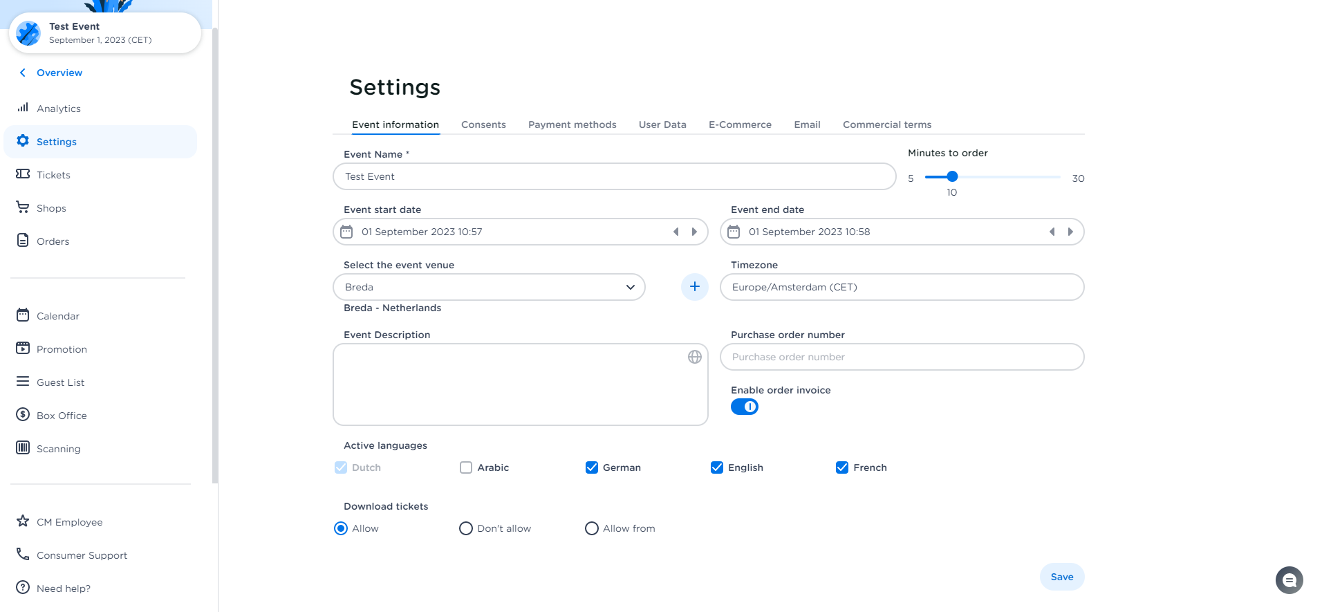 When you enter the ticketing dashboard and go to the left menu to settings, you enter the event information. On the bottom of this page you will find the part about the ticket download.