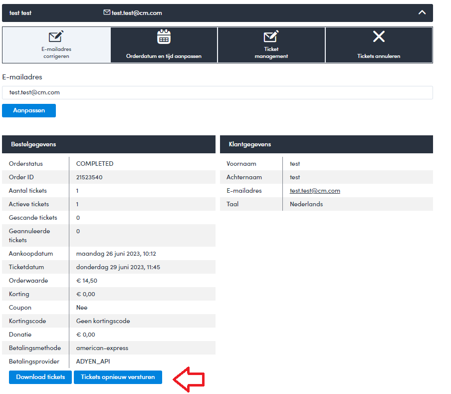 - Wil je daarna de tickets ook opnieuw versturen naar dit nieuwe mailadres? Scrol dan nog iets naar beneden en druk op Tickets opnieuw versturen.