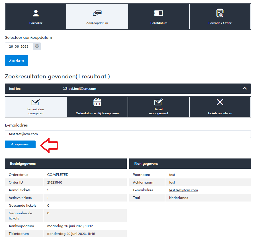 - Zoek het ticket op, dit kan door middel van de bezoekersgegevens, aankoopdatum, ticketdatum of ticket barcode.