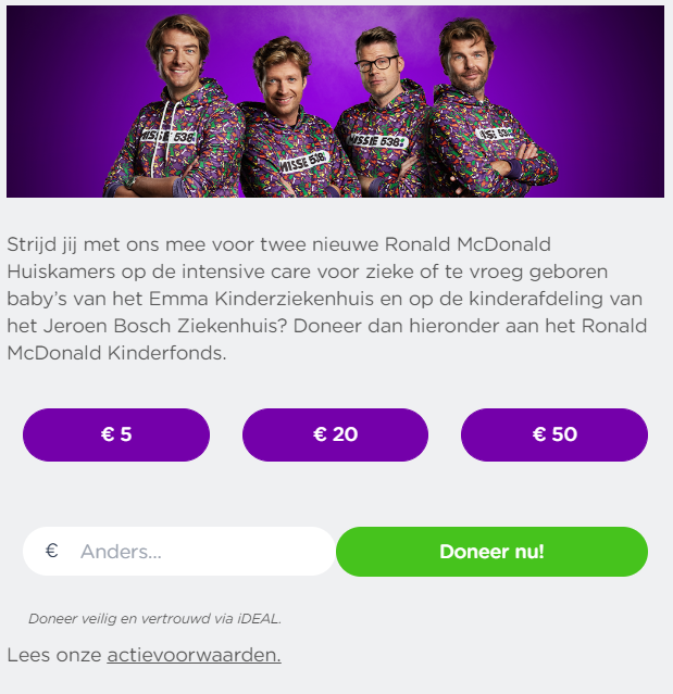 Payment buttons are used for easy payment processing within created landing pages. This is widely used in the Netherlands for fundraising. The processing is done using iDeal. The payment buttons can hold a fixed value or represent an adjustable amount. Generally a few fixed options and an adjustable button is provided on the page to provide a low bar to solicit donations. Please see the example below.