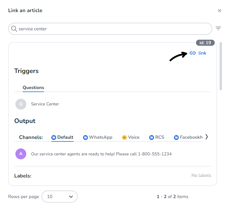 Click the ‘link’ icon located at the top of the article that you want to use in your dialog node: