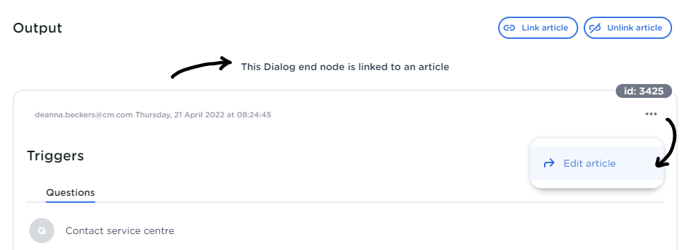 Once you’ve selected this, your dialog node will show that the answer is using a linked article. If needed, you can select the more options menu under the id to edit the linked article: