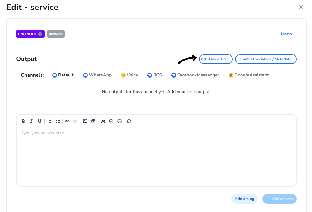 Once you have removed the linked article, you can edit your dialog answer as usual, or use the "Link article" option again to search for a different article to use.