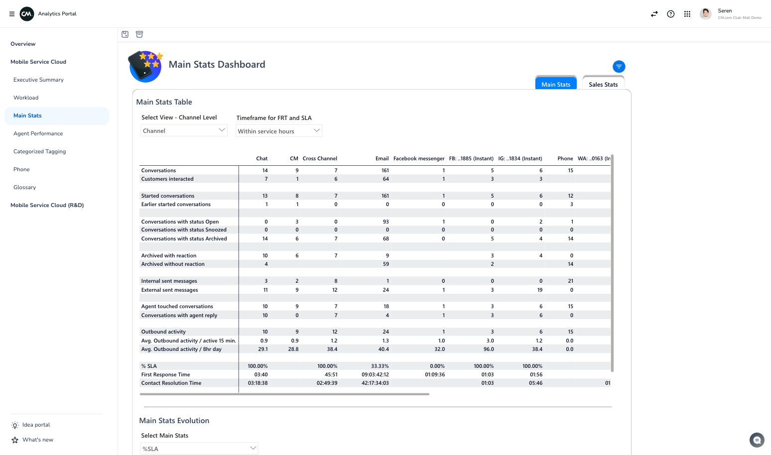 The Main Stats Dashboard provides a comprehensive overview of key operational and sales performance indicators in a single, consolidated table. You can easily explore different perspectives by activating a specific view to focus on particular areas. Additionally, the dashboard includes a trend analysis widget below the table, allowing you to delve deeper into specific metrics over time. This integration between the table and trend analysis enables quick, focused exploration, ensuring you can gain valuable insights with minimal effort.
