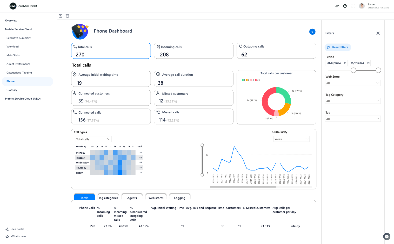 The Native Voice Dashboard provides valuable insights into voice operations, offering a clear overview of total calls—both inbound and outbound—along with key performance metrics relevant to the native voice channel. In the lower section, you can explore detailed heat maps, trend evolutions, and call tags, enabling a deeper analysis of conversation content and uncovering specific trends or issues within calls.