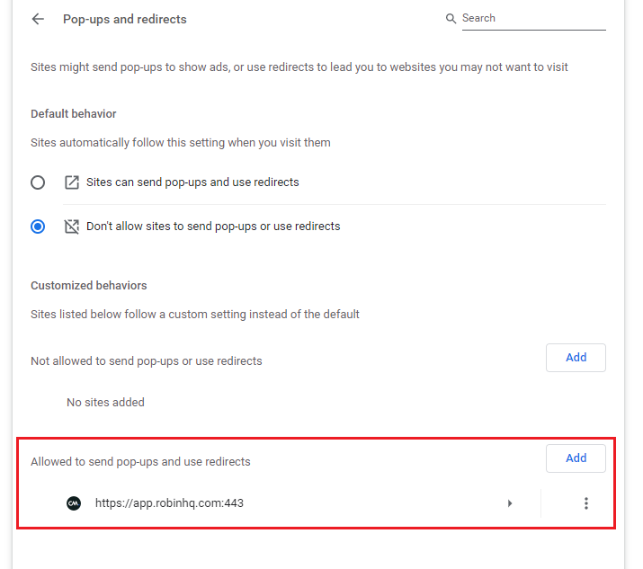 Next, scroll down and click on "Pop-ups and redirects". Make sure our app is in the allowed section as show below: