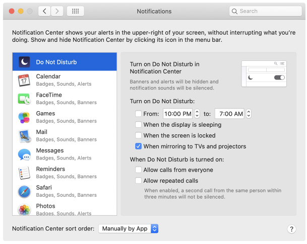 To choose when Do Not Disturb turns on and off, choose Apple menu, System Preferences, then click Notifications. Do Not Disturb settings are at the top of the sidebar: