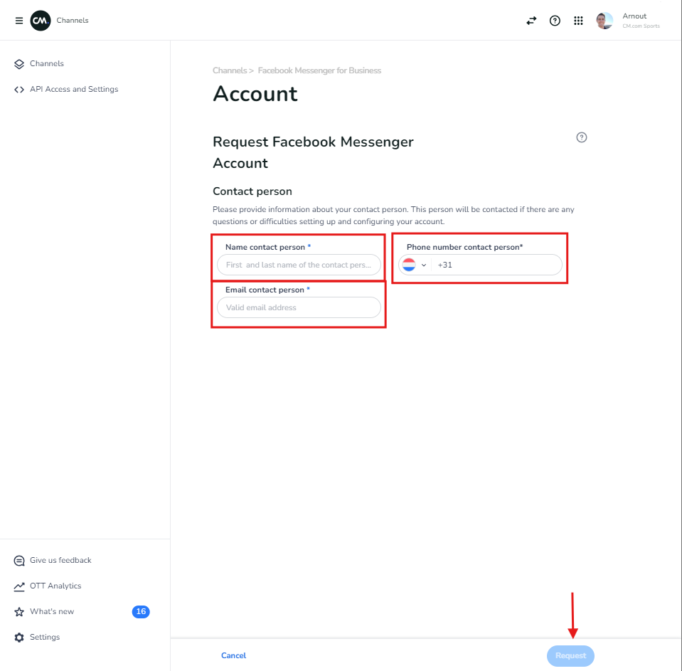 Add your contact details and click on 'request'. This is for CM.com to contact you in case difficulties come up