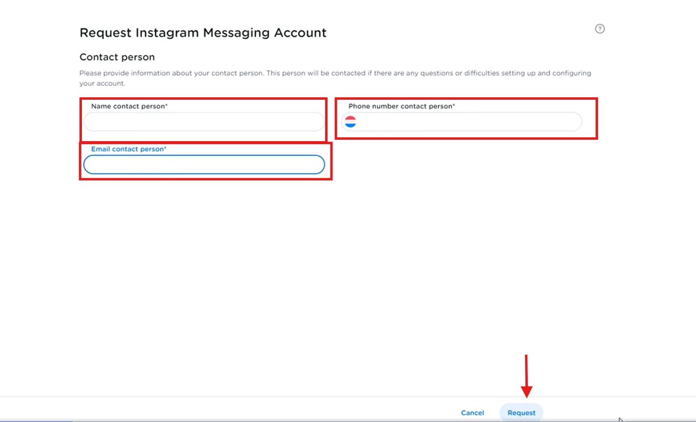 Add your contact details and click on 'request'. This is for CM.com to contact you in case difficulties come up