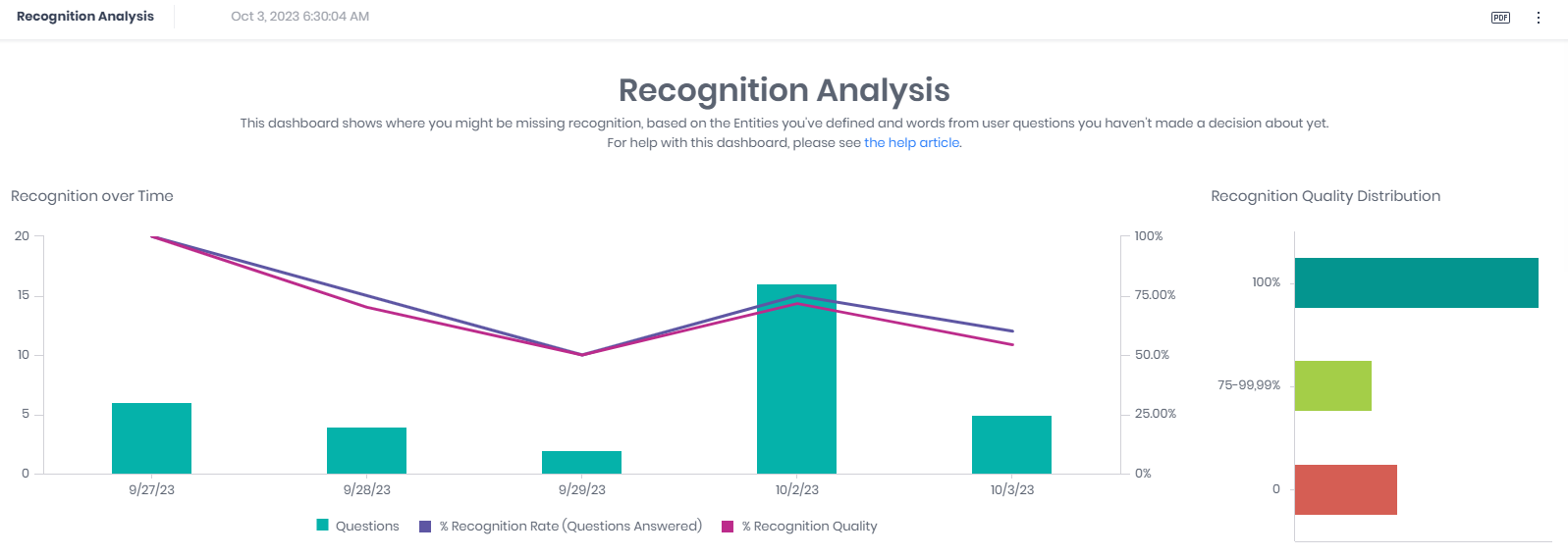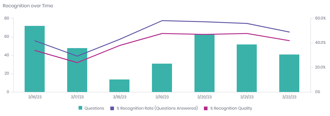 The recognition rate shown in this dashboard is a calculation of the total amount of interactions that received an answer divided by the total amount of interactions. This new iteration of the recognition rate is easier to understand and better aligns with Conversational AI Cloud's AI-driven recognition.