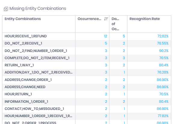 The missing entity combinations widget is the core of the dashboard. This widget gives the top 100 combinations of entities for which there was not an exact match in the Q&A of your knowledge base at the moment the question was asked. The columns after give you counts of how often this combination of entities occurred and on how many days in your selected time period.