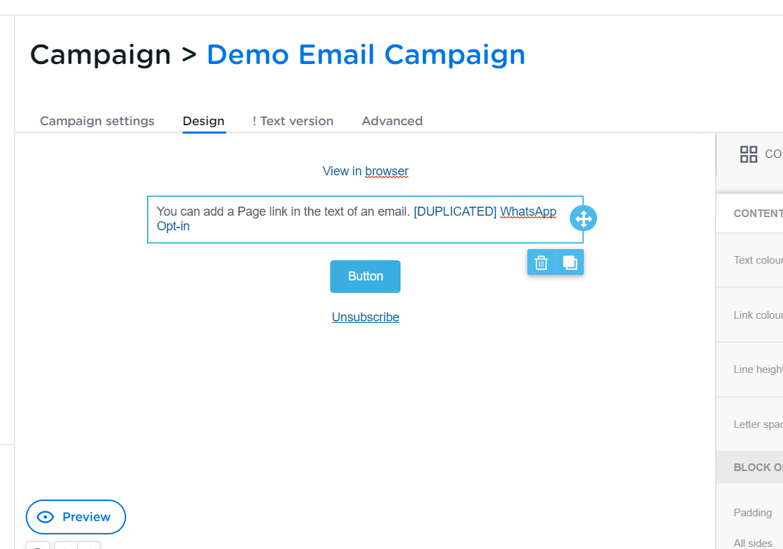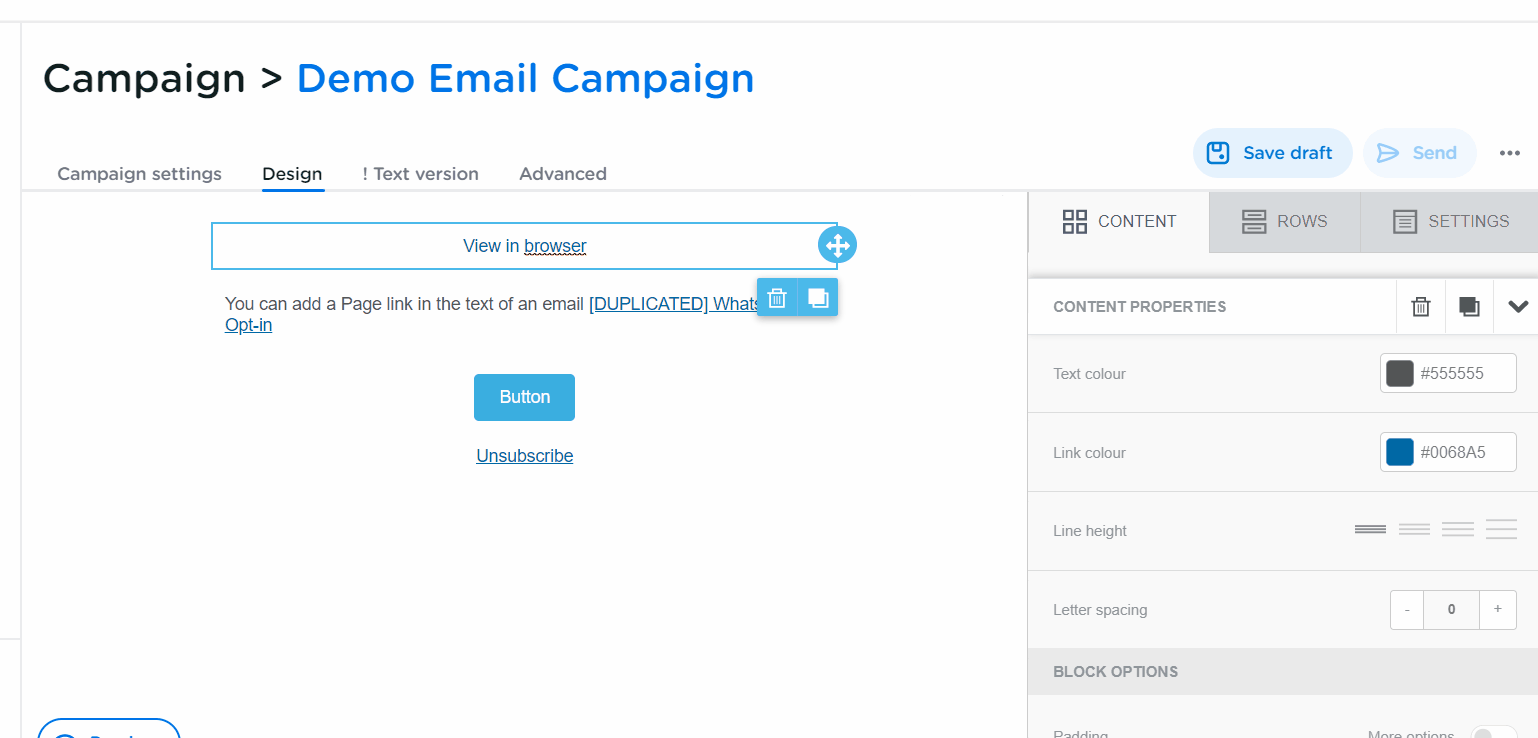 - Buttons within the email editor can also be used to link directly to a page. You can find the button 'Insert page or special link' within the button options on the right side of the screen. In the URL field of the button options this will yield a placeholder for the actual URL that will be filled when the email is send. The placeholder looks like: [[ SpecialLink.Page: <a code made from numbers and letters> ]]
