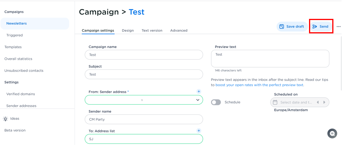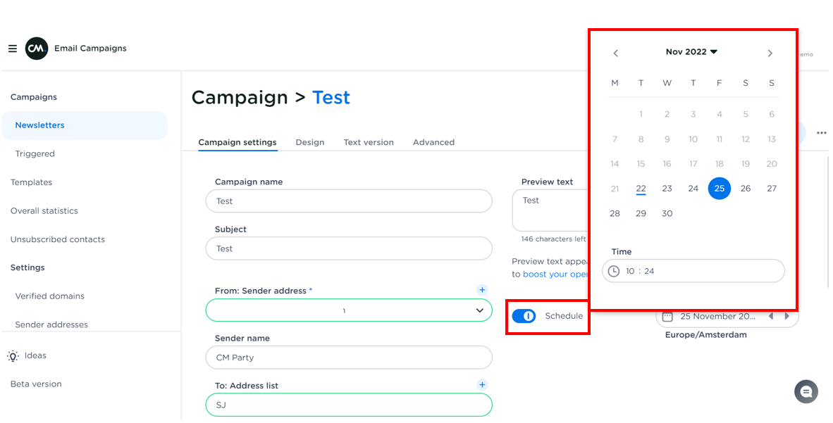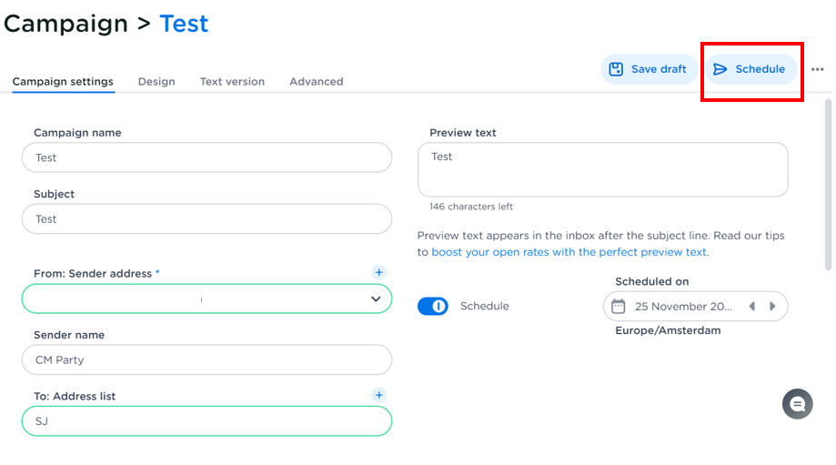 If you have selected the preferred date and time, press "Schedule" to schedule the email campaign.