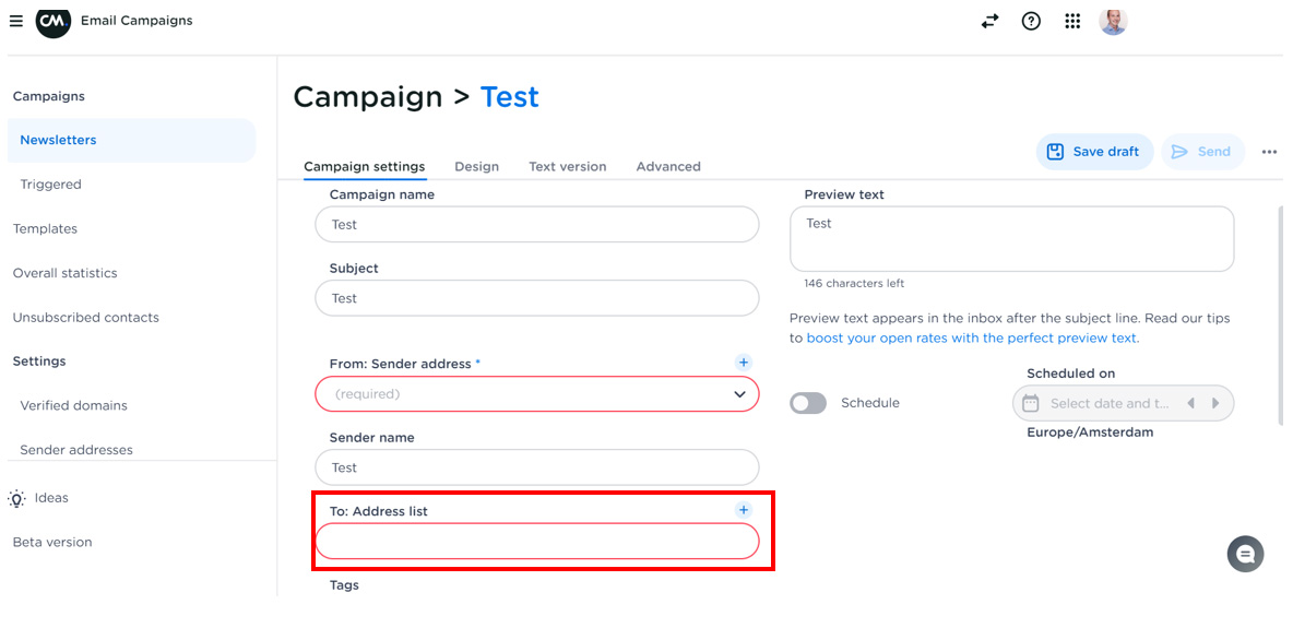 Select "To - address list" to choose the target audience for the email. The lists that appear are lists from the address book.