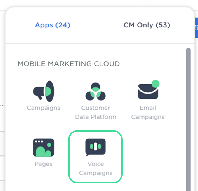 Log in to the CM.com platform and click on the nine dots in the right top corner. Now select "Voice Campaigns" under de Mobile Marketing Cloud header. If you cannot find the icon, please check if it was included in the order.