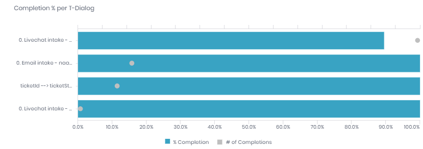 Next to this pie chart is a bar-chart overview of the top 10 completed t-dialogs and their % completion. Select a t-dialog from the pie chart or the dashboard filter if this does not include the t-dialog you are interested in.