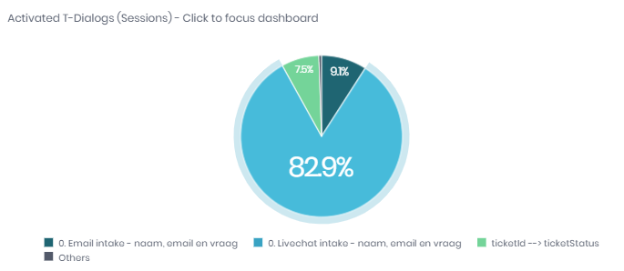 The ‘Activated T-Dialogs’ pie chart gives an overview of the usage of your t-dialog. This uses the number of sessions that a t-dialog was activated in. This way, all your t-dialog are counted equally, regardless of the number of slots required to complete the transaction. You can click on a section of the pie chart to focus the dashboard on that t-dialog.