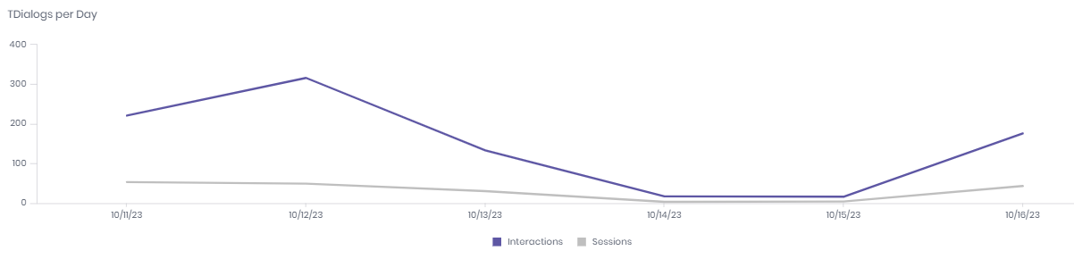 The t-dialog per day chart shows you the number of t-dialog interactions and sessions with t-dialog per day, so giving you a trend over time.